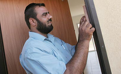 New home: Yosef Ben Dahan puts up mezuza (Photo: Tsafrir Abayov)