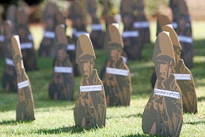 The soldiers also displayed 120 cardboard figures that were placed in memory of those who died during the war in Lebanon. The figures are the same ones the soldiers use for target practice. The three kidnapped soldiers are represented by taller figures (full body shapes) and the rest are shorter (head targets).