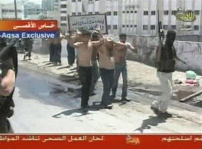 At least 10 dead as Hamas overruns Fatah's Preventive Security headquarters, intelligence services building in Gaza. Official Hamas television broadcasts from inside building, displaying weapons 'sent by Israel.' Hamas gunmen: 'This is the first step in the establishment of an Islamic state'