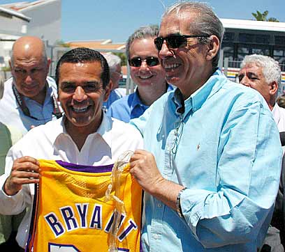 LA mayor presents Moyal with Lakers jersey (Photo: Ze'ev Trachtman)
