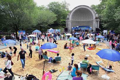 Thousands show up for Frischman Beach party in Central Park as part of Tel Aviv's centennial celebrations. Israelis, Americans dance to Israeli tunes on 15 tons of sand as volunteers hand out popsicles, beach paddles and more
