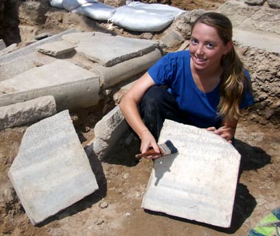 An Antiquities Authority employee holding broken marble tombstone with a Latin inscription, belonging to a person by the name of Maratinus (Photo: Howard Smithline, courtesy of Israel Antiquities Authority)