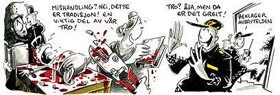 The woman says to entering policemen, “Mistreating? No, this is tradition, an important part of our belief!” The police say, “Belief? Oh yes, then it is all right.”
