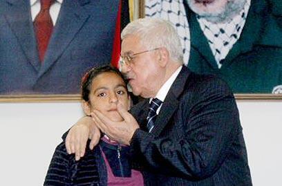President Abbas hugging orphaned child (Photo: AFP)