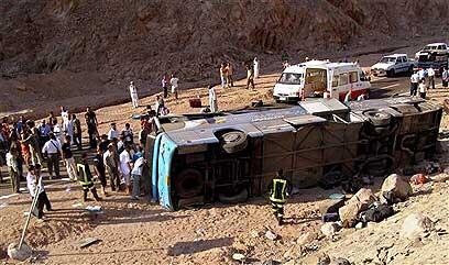 VIDEO - Ten Israeli passengers were killed Tuesday afternoon and dozens were injured as a bus overturned near the Egyptian town of al-Saada near Nuweiba in Sinai. Egyptian authorities and official sources in Sinai reported that 11 people were killed about 50 were injured led in the accident, some of them Israelis from Arab communities in northern Israel.