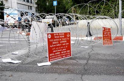 A group of 20 activists from the organization "Anarchists against the Wall" blocked the Basel compound in Tel Aviv Thursday afternoon in protest of the West Bank security fence. The group arrived at one of the intersections in the area and spread a barbwire fence they took from a security fence construction site.