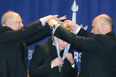Earlier Sunday, Merkel was awarded an honorary doctor degree from the Hebrew University of Jerusalem. The German leader convened with Foreign Minister Tzipi Livni, who also accompanied her to the Yad Vashem Holocaust Memorial Museum, where Merkel placed a wrath at the Yizkor tent and signed the guest book.