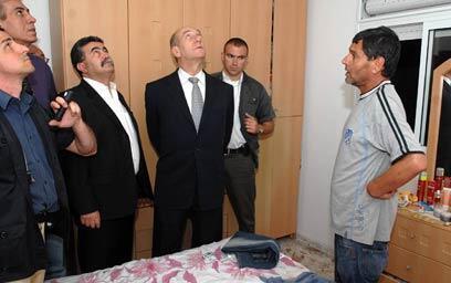 The prime minister and defense minister visited one of the houses hit on Thursday. The two also met with Sderot Mayor Eli Moyal, who accompanied them during the visit. Knesset Member Otniel Schneller (Kadima) also took part in the visit.