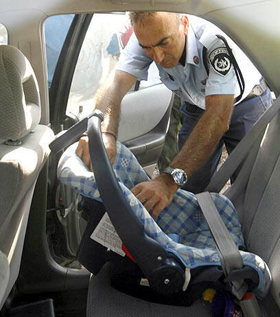 Police officer inspecting baby's car-seat (Photo: Hagai Aharon)