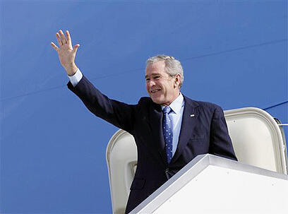 After Air Force One touched down, President Shimon Peres andPrime Minister Ehud Olmert greetedhim. A red carpet was rolled up to the steps of Bush's plane, and military band and honor guard stood on the tarmac.