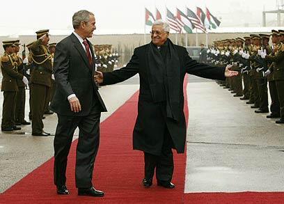 Abbas greeted Bush as he emerged from his car in the walled compound. The two men walked side by side along a red carpet, flanked by Palestinian security in olive-and-gold uniforms.