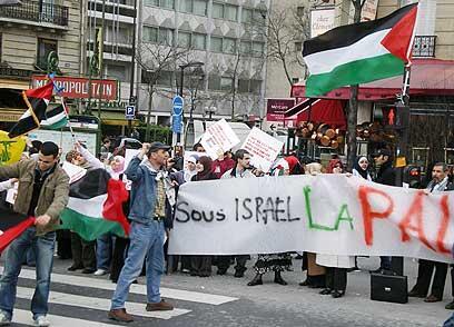 The demonstrators chanted slogans against French President Nicolas Sarkozy, accusing him of "collaborating with Israel ."