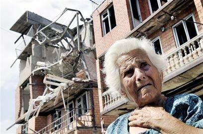 Georgian resident on backdrop of bombed building (Photo: AP)