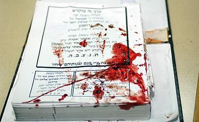 Blood stained book at Mercaz Harav following terrorist attack (Photo: Avi Ohayon)