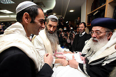 From Left: Dadon, the mohel and Rabbi Amar (Photo: Gil Yohanan)