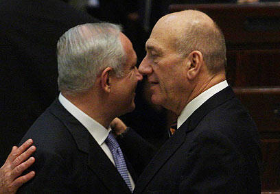 Musical chairs. Olmert and Netanyahu at the ceremony (Photo: Gil Yohanan)