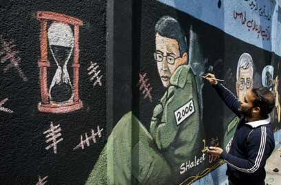 The aged image of Shalit was painted next to one of him 'now,' cowering in a cell. On a nearby wall the protestors added the image of MIA navigator Ron Arad.