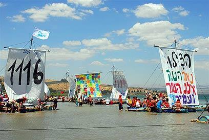 The kibbutz youth worked throughout the past few days to build some 75 rafts out of rope, planks, and barrels. They painted colorful slogans in support of Gilad Shalit on the rafts' sails, such as: "Give us information about Gilad, if he is alive or dead" and "No one knows his fate and if he needs medication." They pushed their homemade rafts into the water Thursday and sailed across the Kinneret for about four hours.