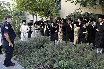 Policeman faces haredim (Photo: Dudi Vaaknin)