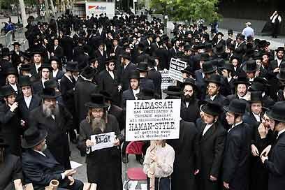 Demonstrators waved signs reading, "Hadassah has instigated a crusade against all Jewish mothers Haman-style of getting even with Mordechai."