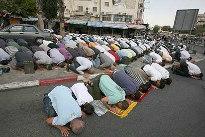 Worshippers praying outside Temple Mount, Friday (Photo: Gil Yohanan)