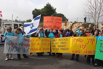 Heads of settlement councils and West Bank municipal and council employees held a demonstration in front of the Prime Minister's Office in Jerusalem against the enforcement of the settlement building moratorium.