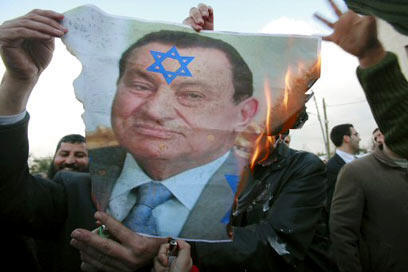 Some 150 people gathered outside the Egyptian embassy in Amman, Jordan on Sunday and burned photos of President Hosni Mubarak. The photos depict Mubarak with a Star of David stamped on his forehead.