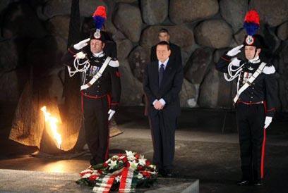 Berlusconi's entourage was accompanied by Education Minister Gideon Saar and Yad Vashem chairman Avner Shalev. At the end of the tour Berlusconi laid a wreath in the Hall of Remembrance and signed the Yad Vashem Guest book. "Our soul screams out – 'This cannot be'. Then it jolts and bellows - Never again!'," he wrote.