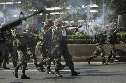 Using armored vehicles and firing semi-automatic weapons from an overpass, soldiers made an early morning advance on an area occupied for more than six weeks by thousands "red shirt" demonstrators in Bangkok's commercial heart.