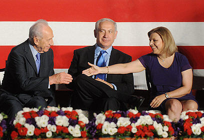 Peres (L) with Netanyahus at event (Photo: Yuval Chen)