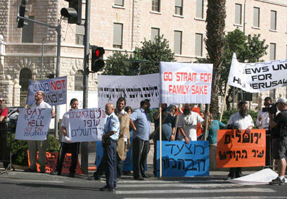 One is being organized by rightists Baruch Marzel and Itamar Ben-Gvir in Paris Square near Independence Park. Dozens of people joined the protest, holding up signs reading: "Sick perverts, get out of Jerusalem."
