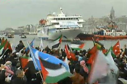 Pro-Palestinian activists gather at Istanbul port to greet ship raided by Israeli commandos on its way to Gaza in late May. Crowds wave Palestinian, Turkish flags; chant 'Allah is great'