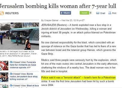 In covering Wednesday's terror attack in Jerusalem theReuters news agency was loath to declare a Palestinian terrorist group was behind the bombing.