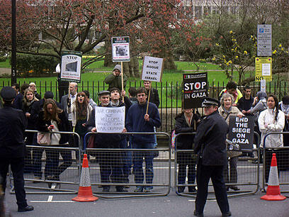 A small group of demonstrators gathered outside the institute and held signs calling Peres a "war criminal." They urged him to lift the siege on Gaza and "end all hostilities".