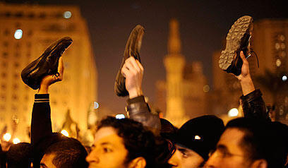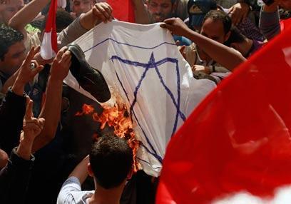 Burning Israeli flag outside embassy in Cairo (Photo: AP)