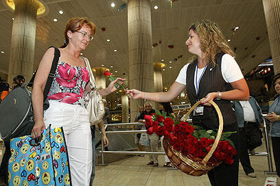Representatives of Israel's Tourism Ministry handed out flowers to people arriving in Ben Gurion International Airport Thursday evening, as promised earlier by Minister Stats Misezhnikov.