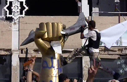 In what will probably become one of the Libyan revolution's most memorable images, the rebels toppled the famous golden statue stationed just outside Gaddafi's palace, depicting a left-handed fist crushing a US fighter jet.