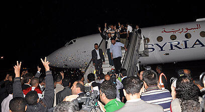 For full coverage of Shalit's homecoming, click here A private plane flew the 10 men and one woman from Cairo to the Turkish capital Ankara, where they were met at Esenboga Airport by the Palestinian ambassador to Ankara Nabil Maarouf and Turkish foreign ministry officials. 📷 Amna Muna gestures V in Ankara (Photo: Reuters) "The Palestinian government and the Palestinian people want to thank Turkey, the government, the people, for all their help and support to Palestine in general, and what they did in helping in releasing these people and receiving them here. God willing we shall continue to receive more support from Turkey until Palestine is liberated," Maarouf said. Among the Palestinians was Amna Muna, who on Tuesday caused a brief delay in the implementation of the deal after refusing to be moved to the Gaza Strip. Muna lured teenager Ofir Rahum to his death in 2001. She is considered the leader of the female Palestinian prisoners held in Israel and previous reports suggested she terrorized inmates. It was feared that families of the prisoners will seek revenge over her abuse of the other inmates. 📷 Landing in Turkey (Photo: AFP)"We are grateful to the Turkish government for its support in the process of releasing the Palestinians and bringing them to Turkey," state-run Anatolian news agency quoted Maarouf as telling reporters at the airport. "God willing we will continue to seek Turkey's support until Palestine attains freedom," he added. Media reports said the 11 were spending the night in Ankara but it was not disclosed where for security reasons. Turkish Foreign Minister Ahmet Davutoglu had announced on Tuesday that about 10 Palestinians would come to Turkey. Some 40 of the Palestinians were sent to Turkey, Syria and Qatar. Davutoglu said Turkey was willing to assist the prisoner exchange as it believes it will support the peace process. He described the prisoner swap as having a humanitarian element. Meanwhile, Turkey's Hurriyet newspaper quoted an official source as saying Ankara will keep the prisoners away from the public eye for the time being for their own personal safety. Israel, the report said, did not demand any special conditions from Ankara in handling the prisoners.