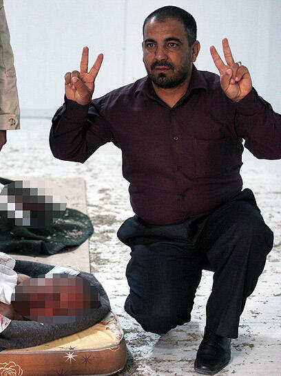 Man poses for camera near Gaddafi's body (Photo: Reuters)