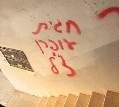 The unknown vandals also wrote "Hagit Ofran – zal (of blessed memory)" and "Givat Assaf" – an illegal outpost in the West Bank which is slated for evacuation by the State. The Right is protesting against the planned razingof a number of illegal outposts. The phrase "regards from Oz Zion" was spray-painted in the building's stairwell. Oz Zion is a West Bank outpost which was cleared on Monday. Twelve people were arrested during its evacuation .
