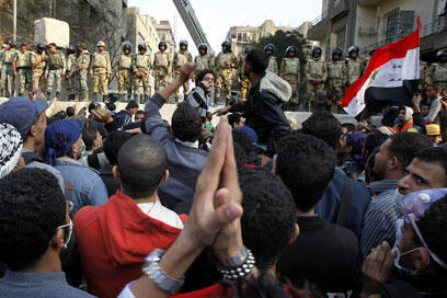 Protesters opposite soldiers in Tahrir Square (Photo: EPA)