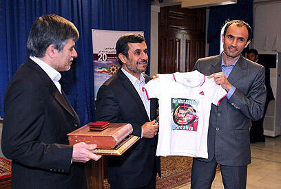 Iran's Ahmadinejad with t-shirt of slain scientist (Photo: AFP)