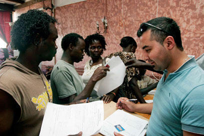 Migrants signing voluntary departure forms (Photo: Eliad Levy)