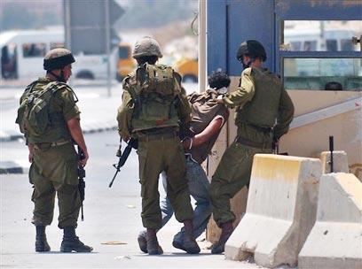 - IDF soldier detaining Palestinian in Shechem (Photo: AP)