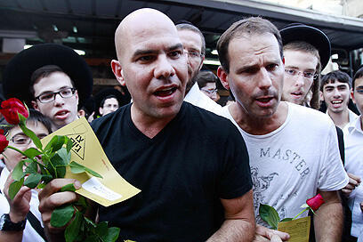Protesters and haredim in Bnei Brak (Photo: Amir Levy)