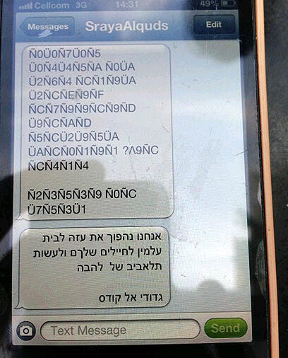The message read: "We will turn Gaza into your cemetery and make a Tel Aviv of flames. Al-Quds Brigades." The message was written in Hebrew and contained many spelling mistakes.