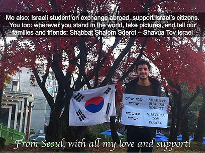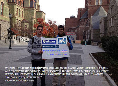 Pictures bearing the message "Shabbat Shalom Sderot" were sent from Singapore, Madrid, Seoul and other cities, either by Israeli students studying abroad or by the local Jewish communities. Students of the "Hillel Torah" Jewish school in Illinois wrote: "The school supports the residents of Israel and IDF soldiers. Our students pray daily for their peace".
