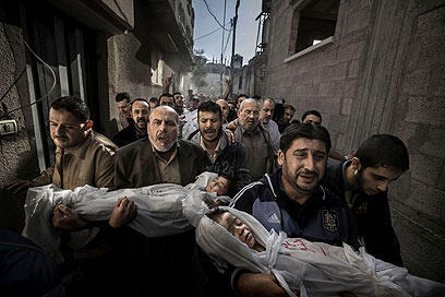 Hansen's Nov. 20 shot won top prize in both the spot news single photograph category and the overall competition. It portrays 2-year-old Suhaib Hijazi and her 3-year-old brother Muhammad, who were killed when their house was destroyed by the Israeli attack. They are being carried by grieving uncles, as their father Fouad was also killed, and his body can be seen in the background of the picture.