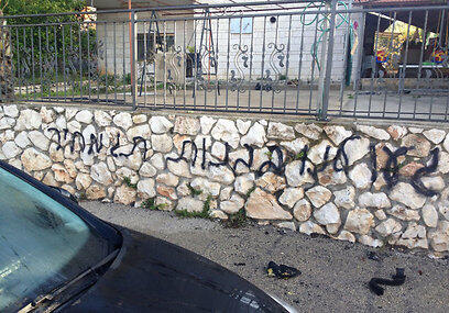 Graffiti found on wall in village of Akbara near Safed says 'price tag.' Owner: Arson is racist, not nationalistic. Police: It's a prank