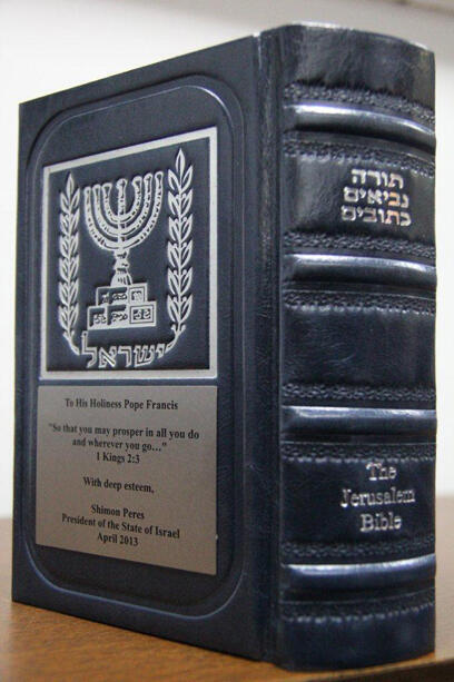 Peres gave the Pope a Bible, inscribed "To his Holiness Pope Francis, 'So that you may prosper in all you do and wherever you go' (1 Kings 2:3).